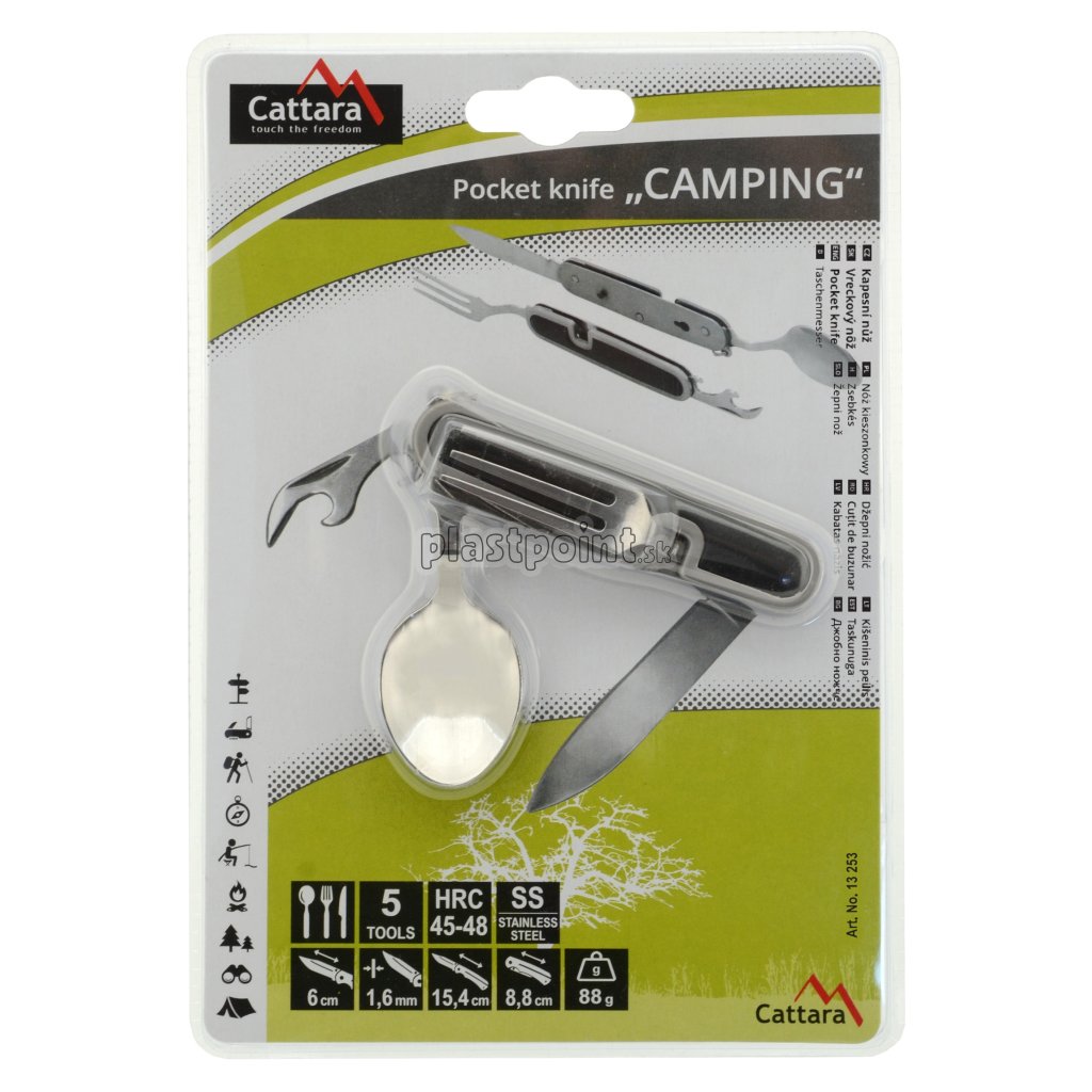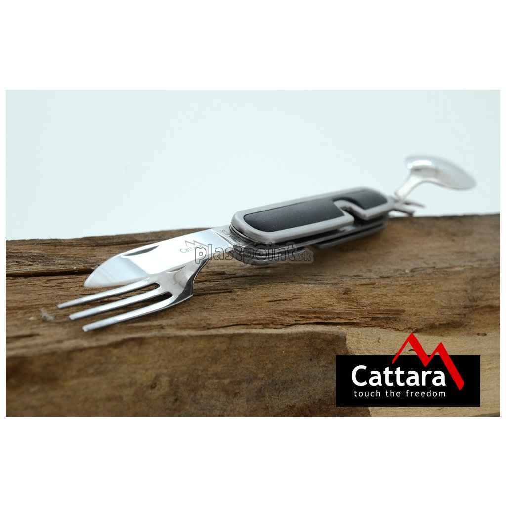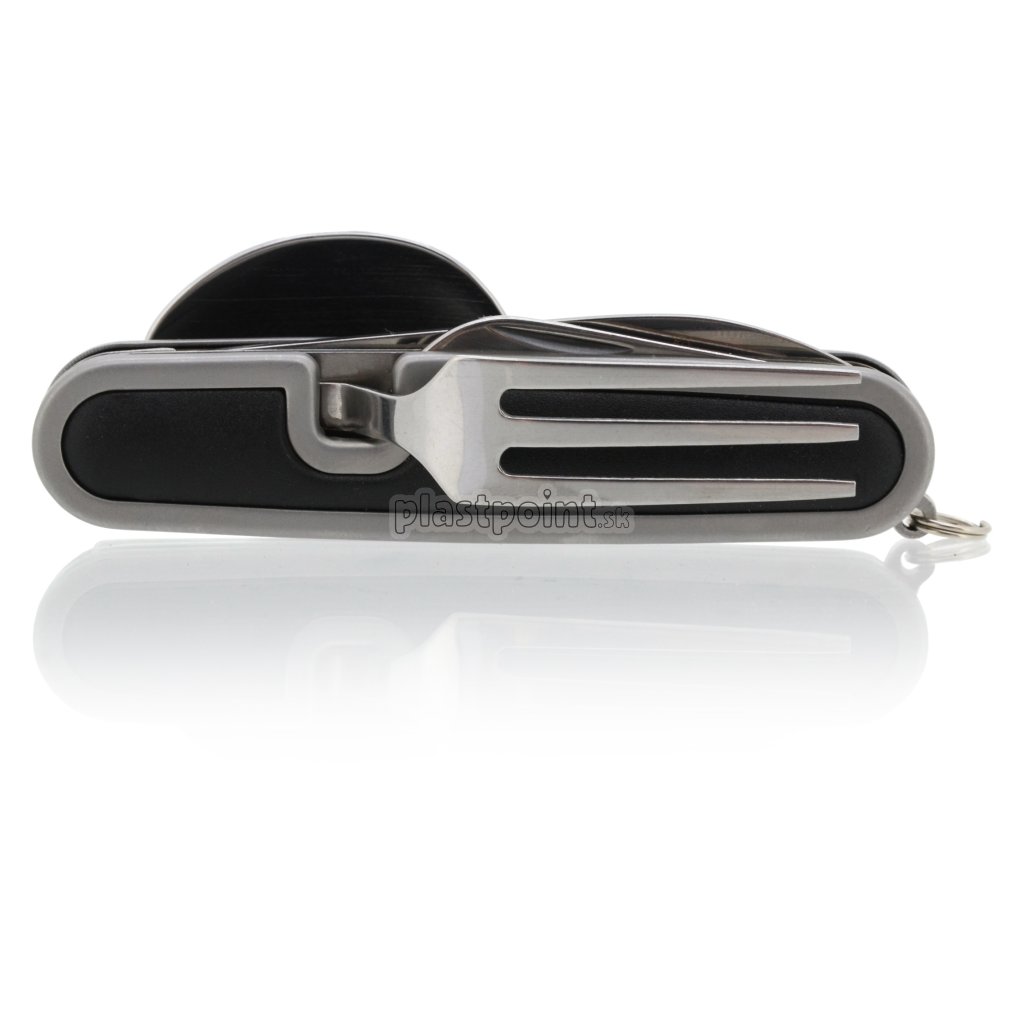 Prvá časť noža sa skladá z vidličky, otvárača na plechovky a viečka fliaš, druhá časť skrýva lyžicu a samotnú čepeľ noža.