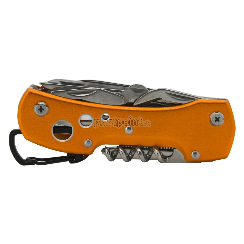 Multifunkčný nôž z alumínia žlto-zlatej farby, s nástrojmi z nožiarskej ocele. Užitočný pomocník Multi pre camping, rybárčenie a ďalšie outdoor využitie.