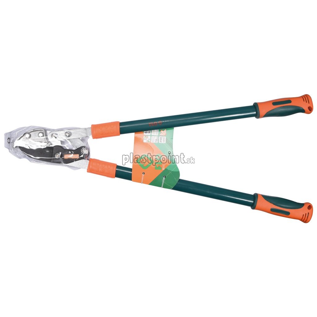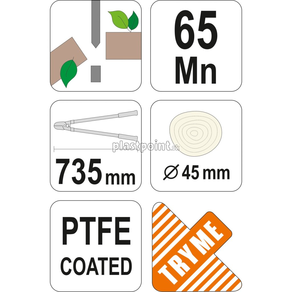 Ručné záhradné nožnice,z materiálu 65Mn vrchná čepeľ potiahnutá PTFE s rovným strihom o celkovej dĺžke 735 mm priemeru strihu do 45 mm, určené k strihu vetiev s protišmykovou rukoväťou pre bezpečné držanie.