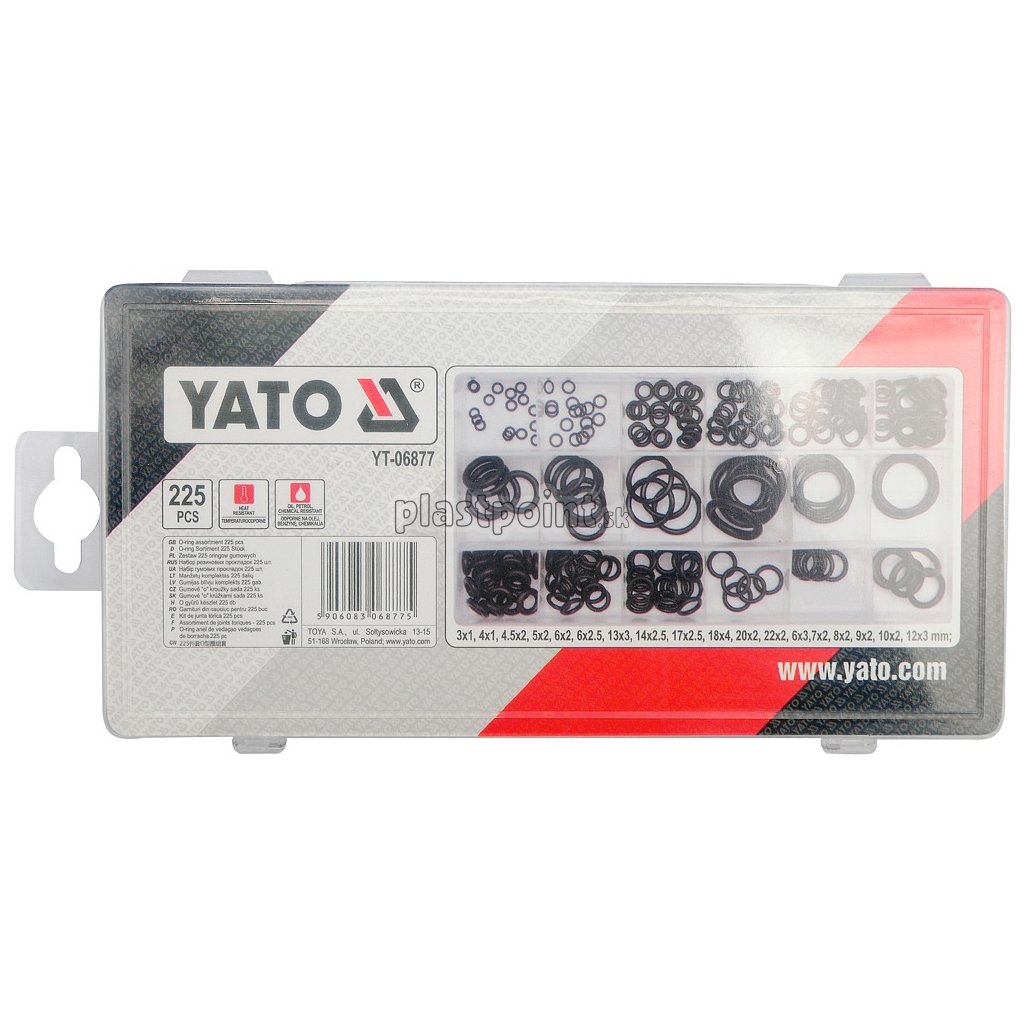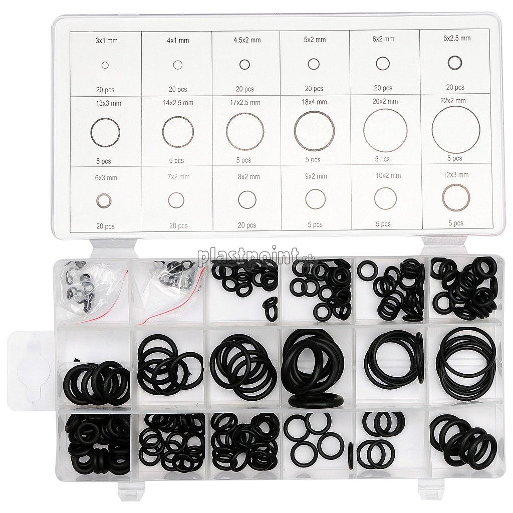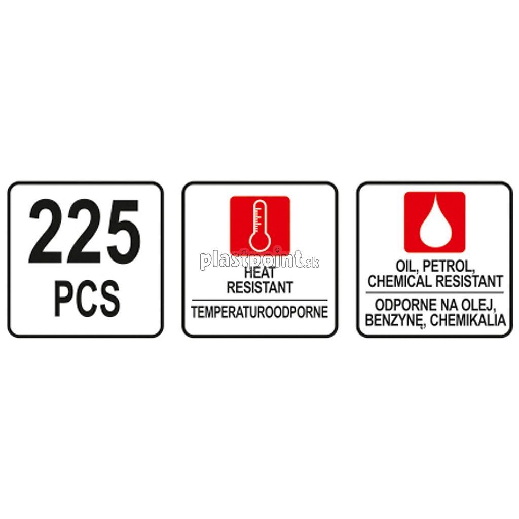 Sada 225 ks o-krúžkov vyrobených z odolnej gumy, odolávajúcej oleju, palivu, chemikáliám a vysokým teplotám.