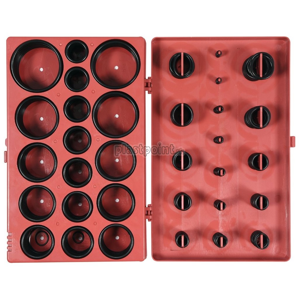 Všetky o-krúžky súúhľadne usporiadané v plastovom kufri.