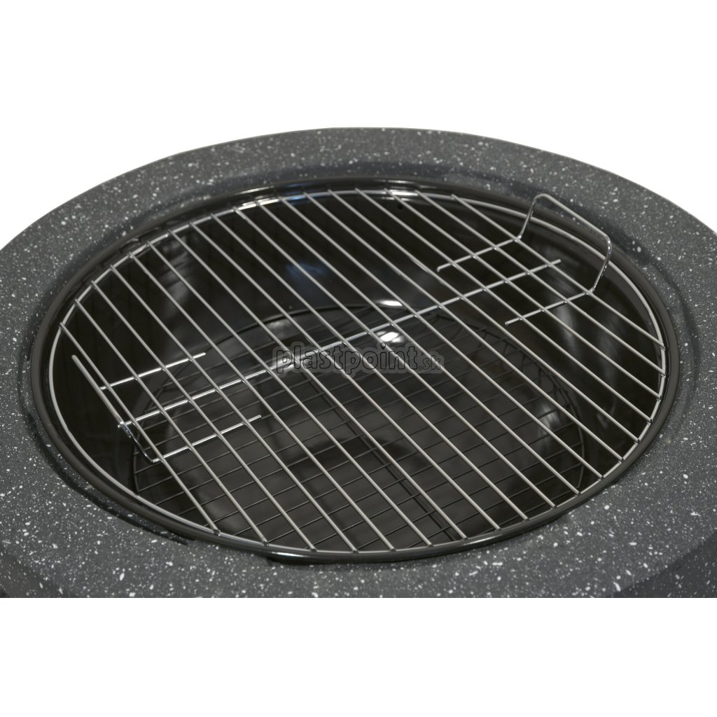 Vnútorná časť ohniska je vyrobená z kvalitnej ocele s vysokoteplotným čiernym náterom uloženej v pevnom a teplote odolnom tele z páleného kameňa z Oxidu Horečnatého. Na grilovanie je ohnisko vybavené oceľovým roštom priemeru 44 cm.