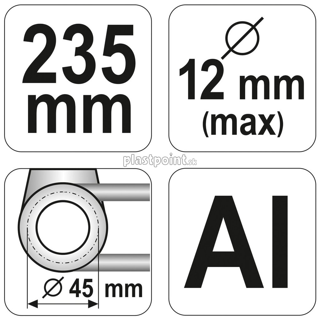 Prípravok je zhotovený zo zliatiny hliníka a je určený pre rúrky s priemerom 12 mm. Rádius ohnutia je 45 mm. Celková dĺžka prípravku 235 mm.