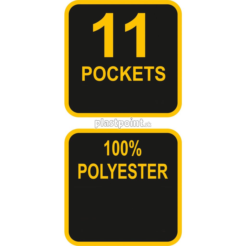 Opasok na náradie a drobnosti s 11 vreckami a dvoma oceľovými hákmi. Zhotovenie z nylonu 600D so švami vystužené kovovými nitmi.
