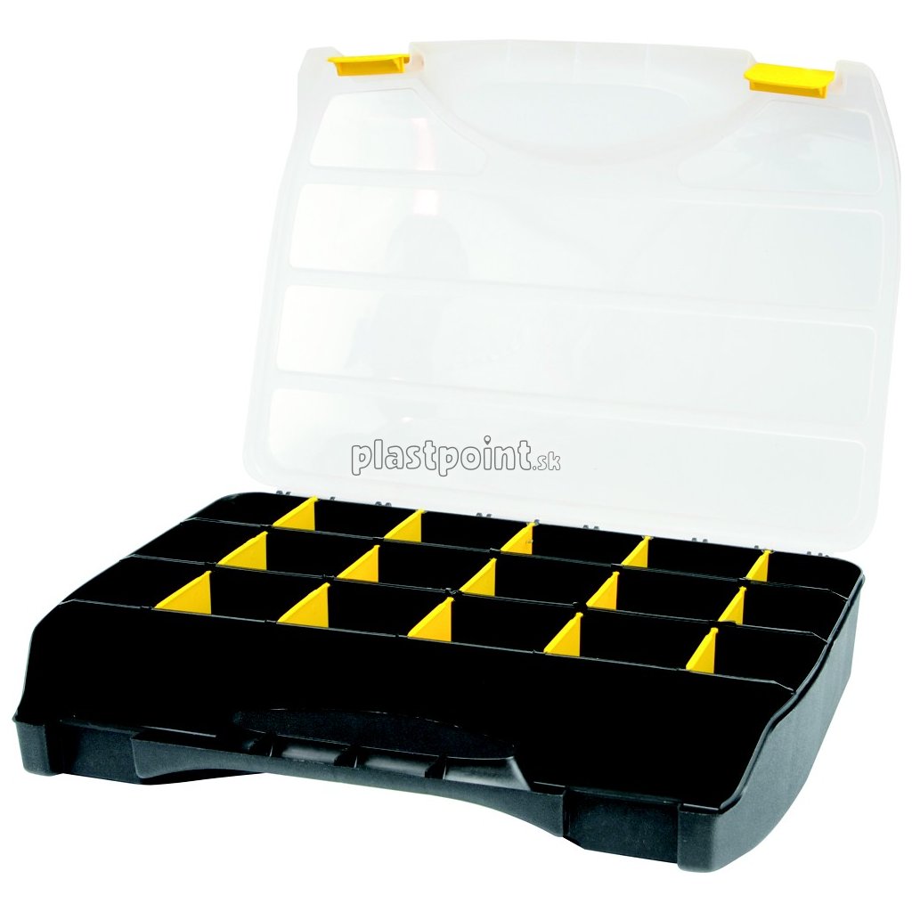 Organizér s rozmermi 36 x 27 x 6,8 cm vyrobený z plastu. Určené na skladovanie drobných predmetov, ako sú malé spojovacie prvky, náhradné diely a náradie. Užitočné doma, v garáži, dielni atď.