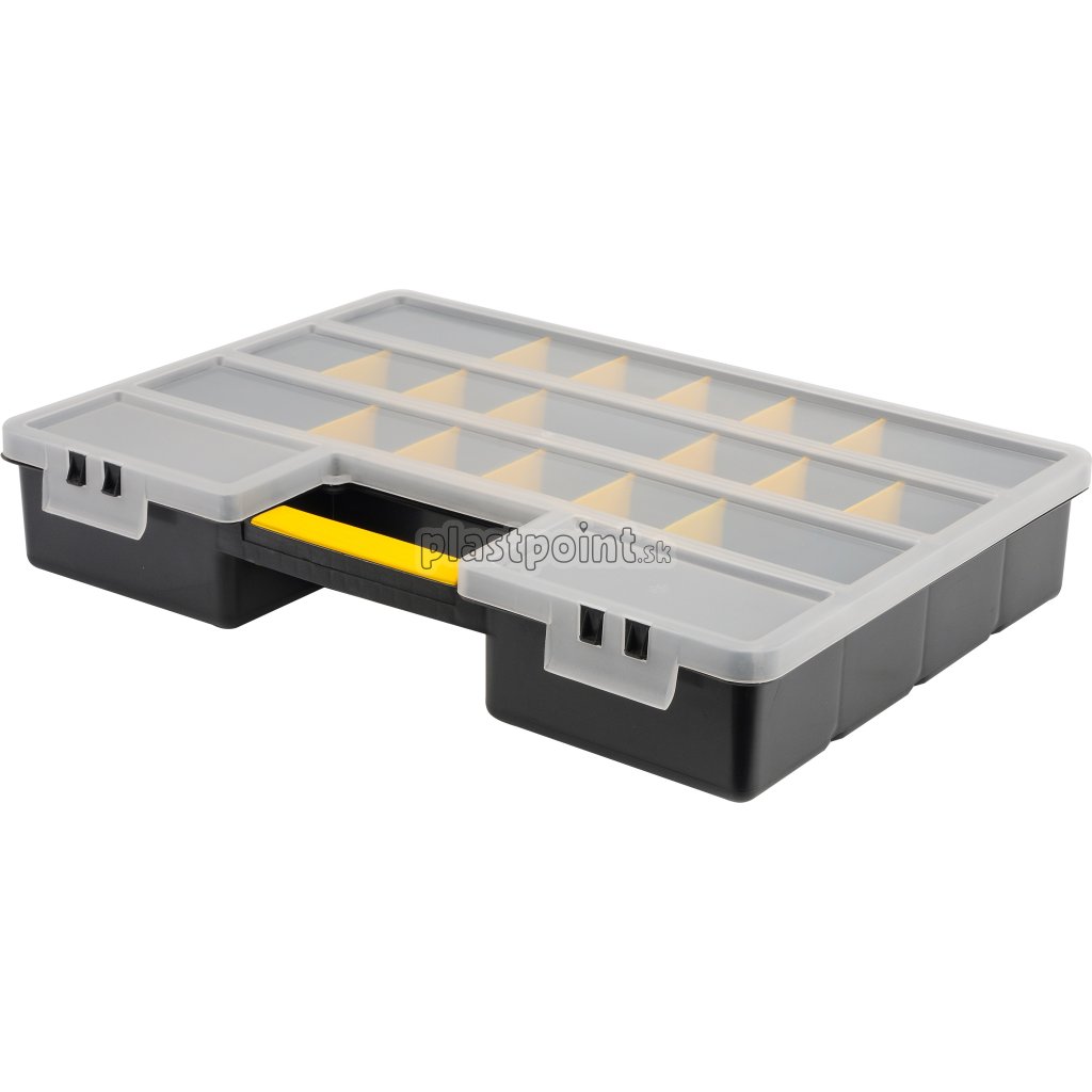 Organizér s rozmermi 46 x 32 x 8 cm vyrobený z plastu. Určené na skladovanie drobných predmetov, ako sú malé spojovacie prvky, náhradné diely a náradie. Užitočné doma, v garáži, dielni atď.
