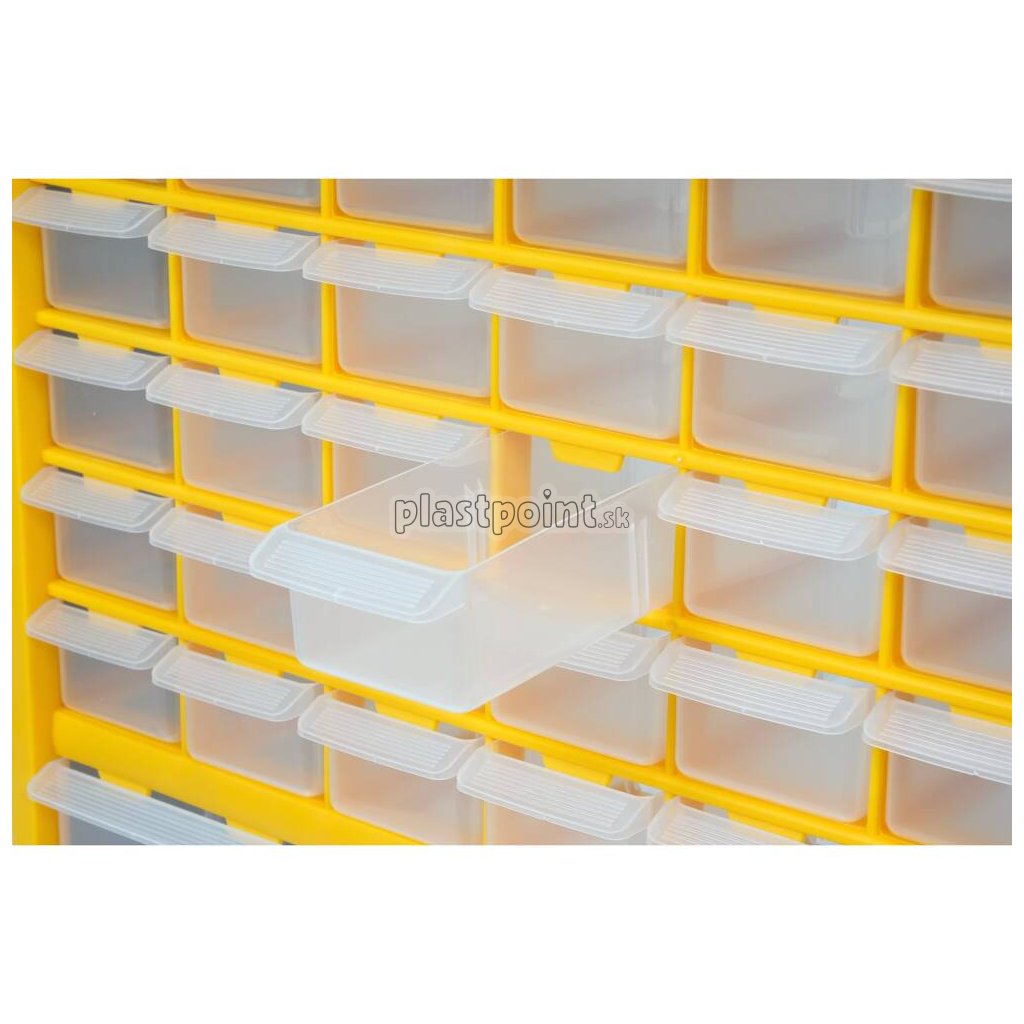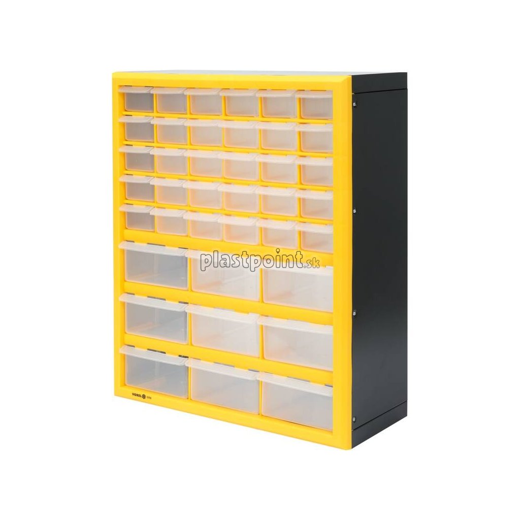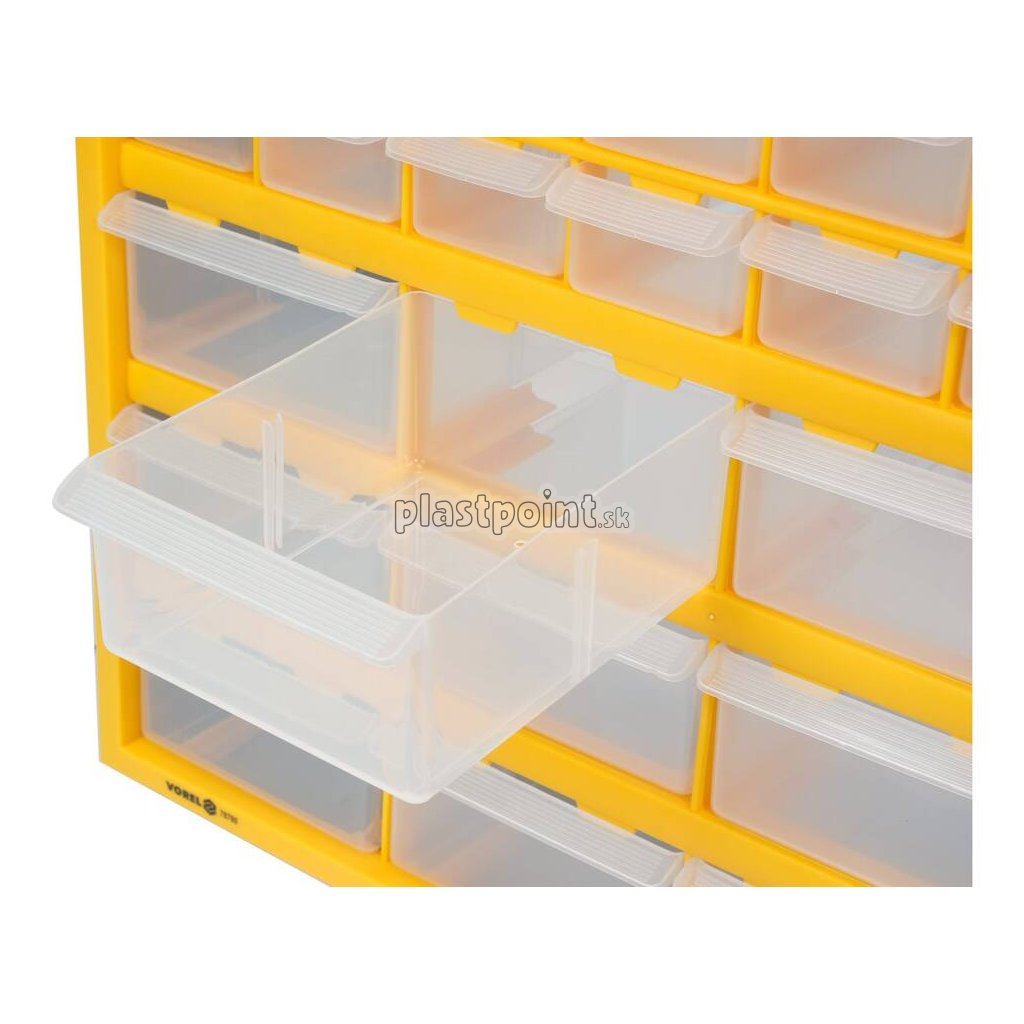 Dielenský organizér so zásuvkami 475 x 380 x 160 mm. Určené na uloženie drobných predmetov, ako sú drobné spojovacie prvky, náhradné diely a náradie, 39 zásuviek.