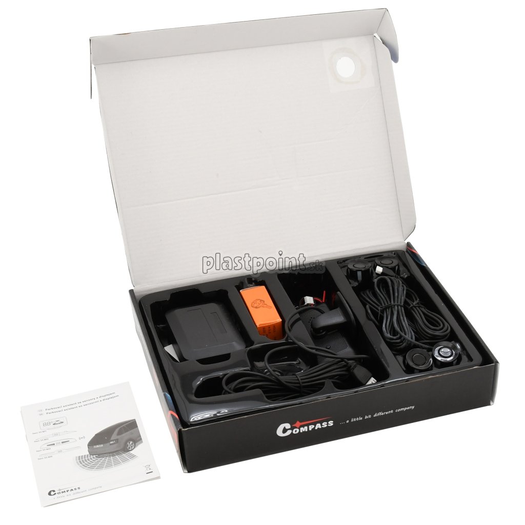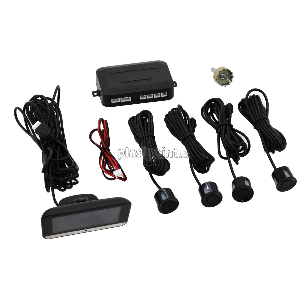 Balenie obsahuje displej, riadiacu jednotku, 4 senzory pre montáž do zadného nárazníka, zodpovedajúcu kabeláž a vrták zodpovedajúceho priemeru.