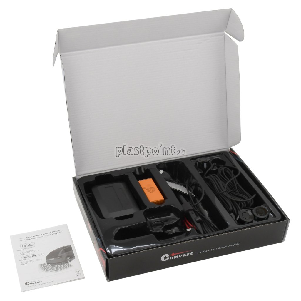 Balenie obsahuje displej, riadiacu jednotku, 4 senzory pre montáž do zadného nárazníka, zodpovedajúcu kabeláž a vrták zodpovedajúceho priemeru.