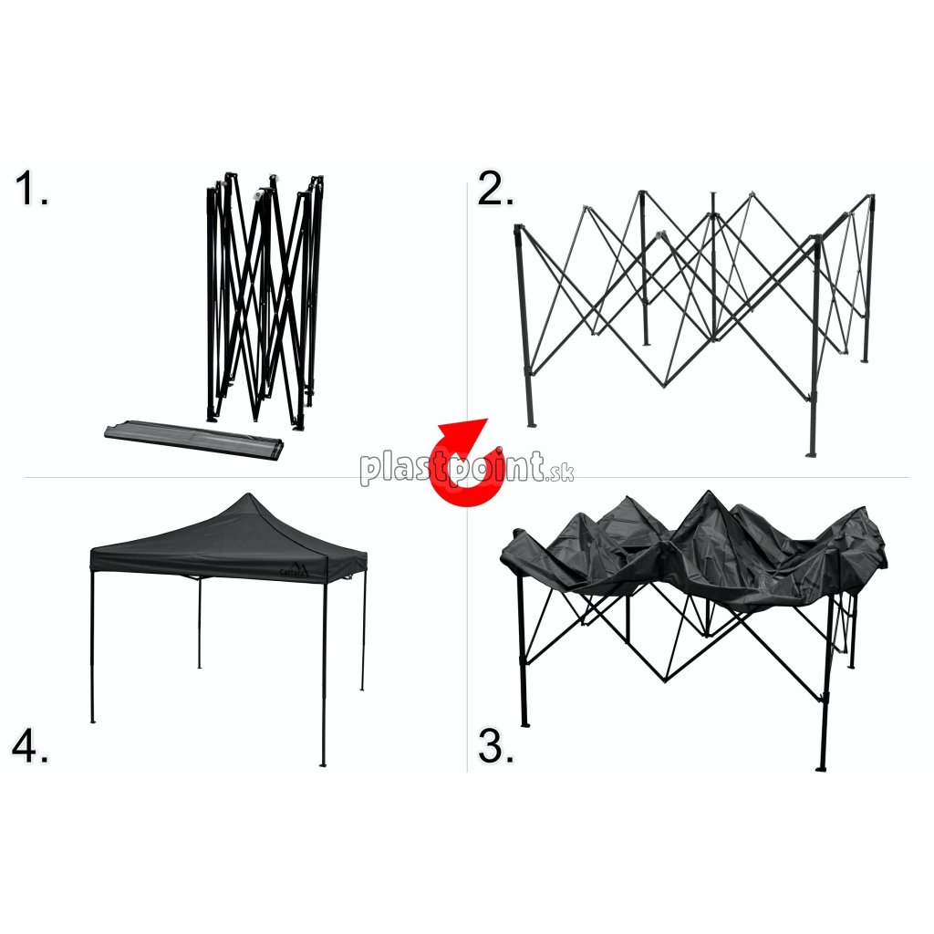 Skladacia párty stan s rozmermi 3 x 3 m s podchádzajúcou výškou 2 m.