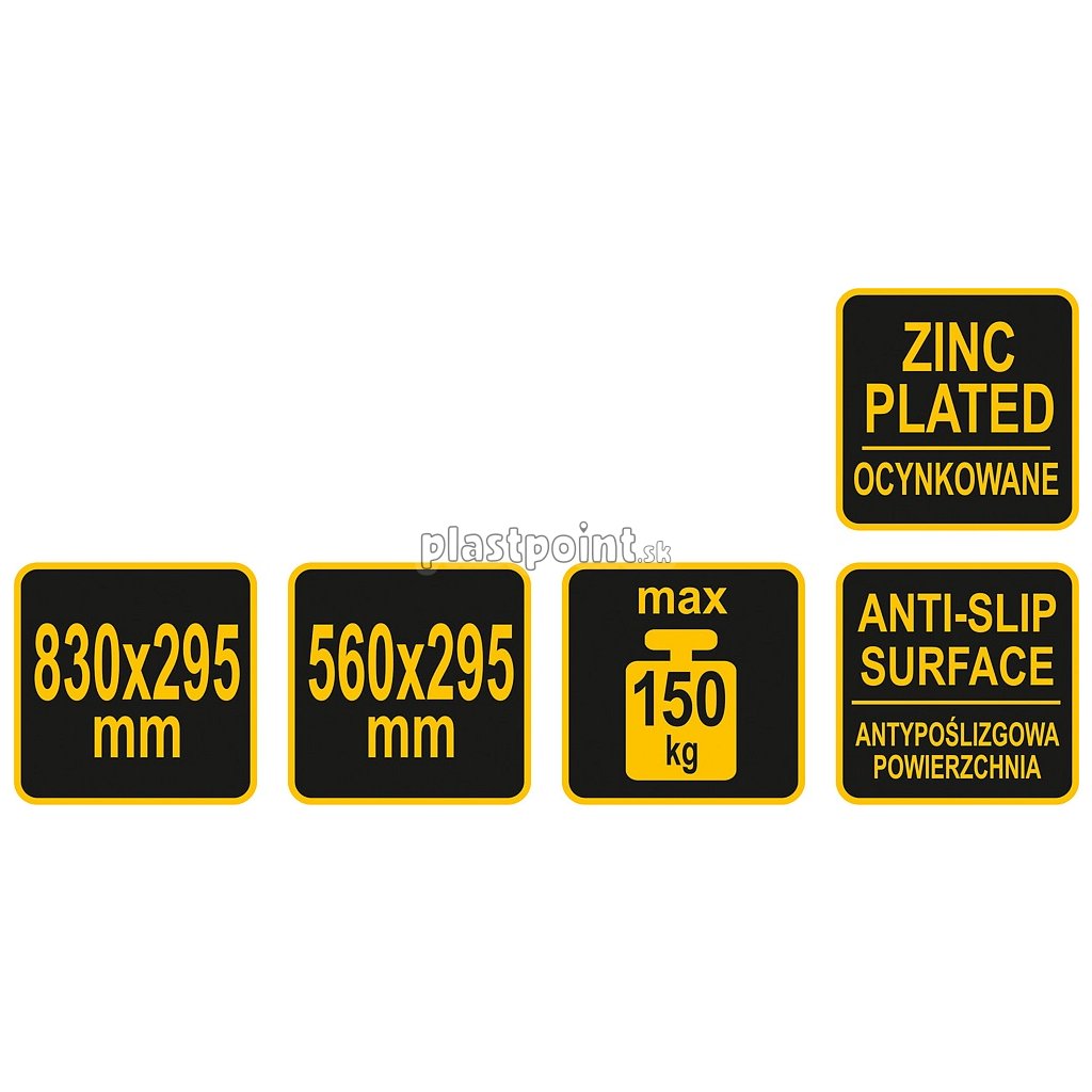 Plošina pre rebrík TO-17704 sa skladá z dvoch čiastkových platforiem (veľkosti 56 x 29,5 cm a 83 x 29,5 cm). Platformy sú zhotovené z odolnej pozinkovanej ocele, celá plošina tak poskytuje nosnosť až 150 kg.