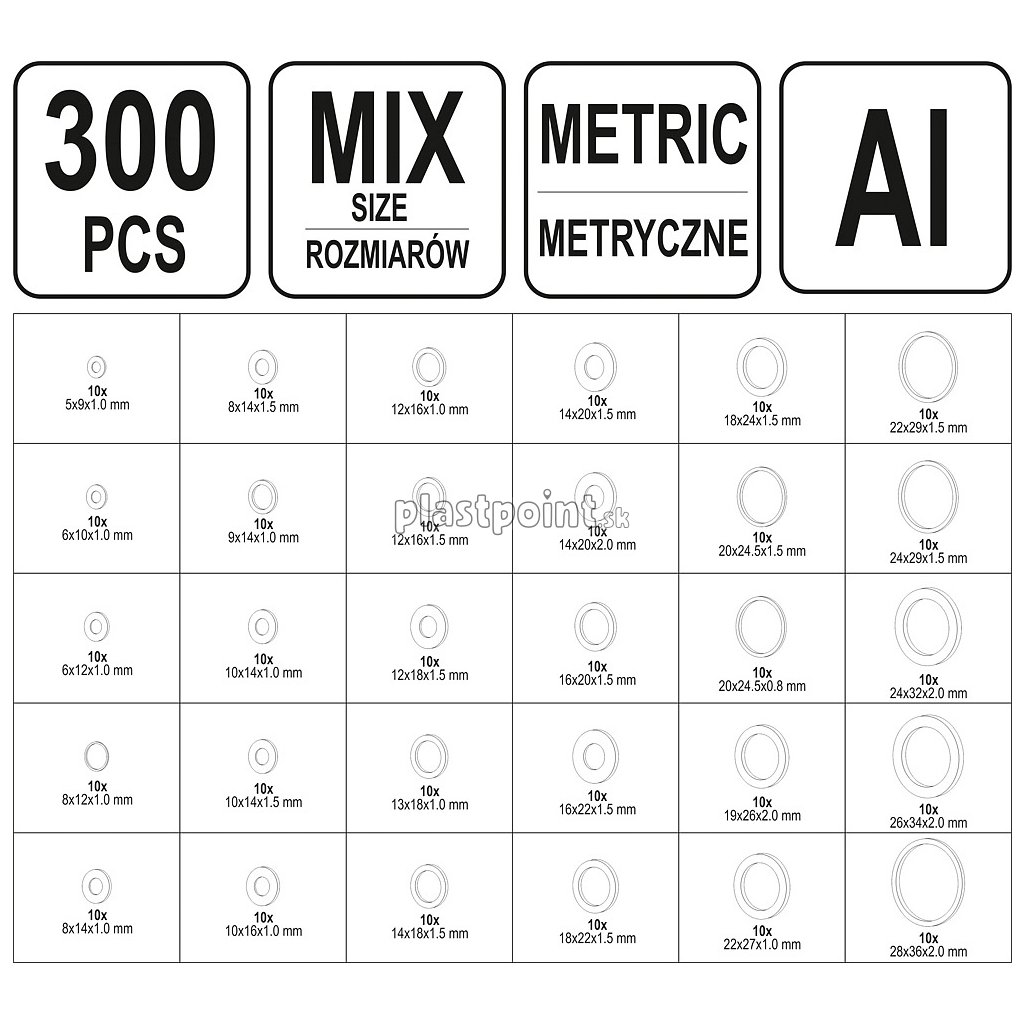 Sada 300 ks kvalitných hliníkových podložiek rozmerov od 5 x 9 mm do 28 x 36 mm, spolu 30 druhov podložiek po 10 ks.