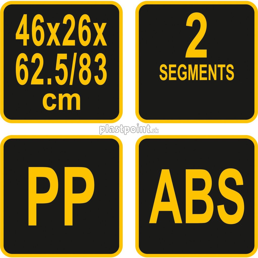 Vyrobené z plastu s rozmermi 46 x 26 x 62,5 (83) cm odolného proti mechanickému poškodeniu.