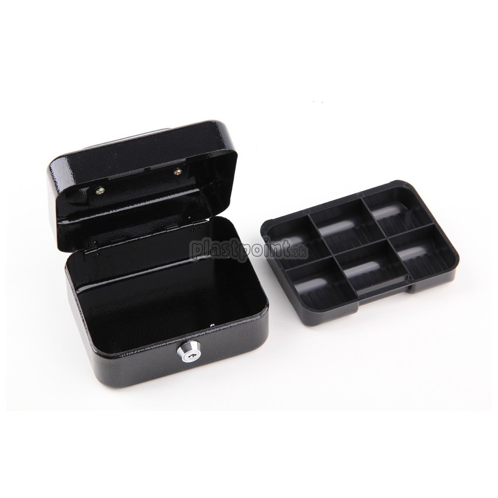 Prenosná pokladňa s rozmermi 150x120x80mm. Vyrobené z oceľového plechu s hrúbkou 0,7 mm, čierno natreté. Zamykanie na kľúč. Sada obsahuje 2 kľúče. Odnímateľná plastová vložka na mince vo vnútri.