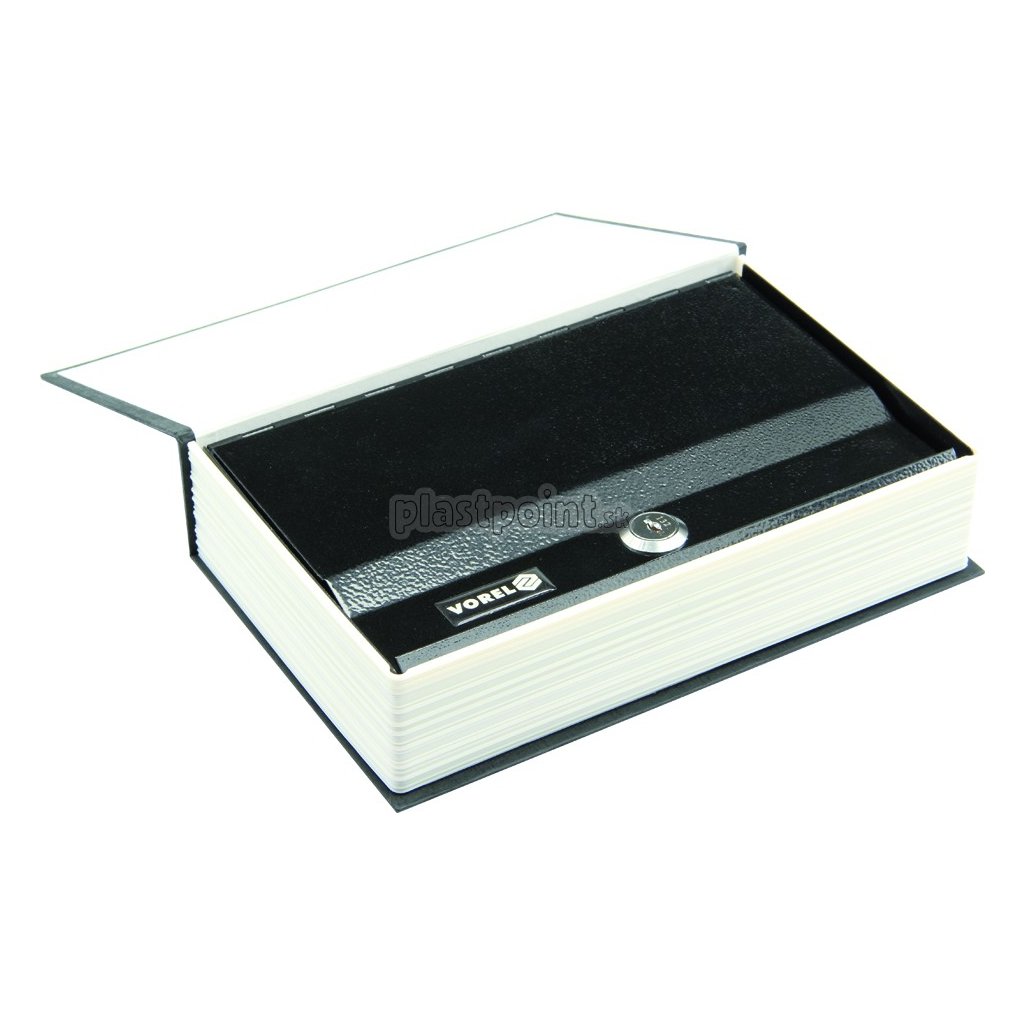 Prenosná peňažná kazeta v tvare knihy, rozmery 240 x 155 x 55 mm. Kryt je vyrobený z lepenky a vnútorná kazeta je vyrobená z oceľového plechu s hrúbkou 0,7 mm, natretá čierno. Uzamykateľná kazeta. Sada obsahuje 2 kľúče.