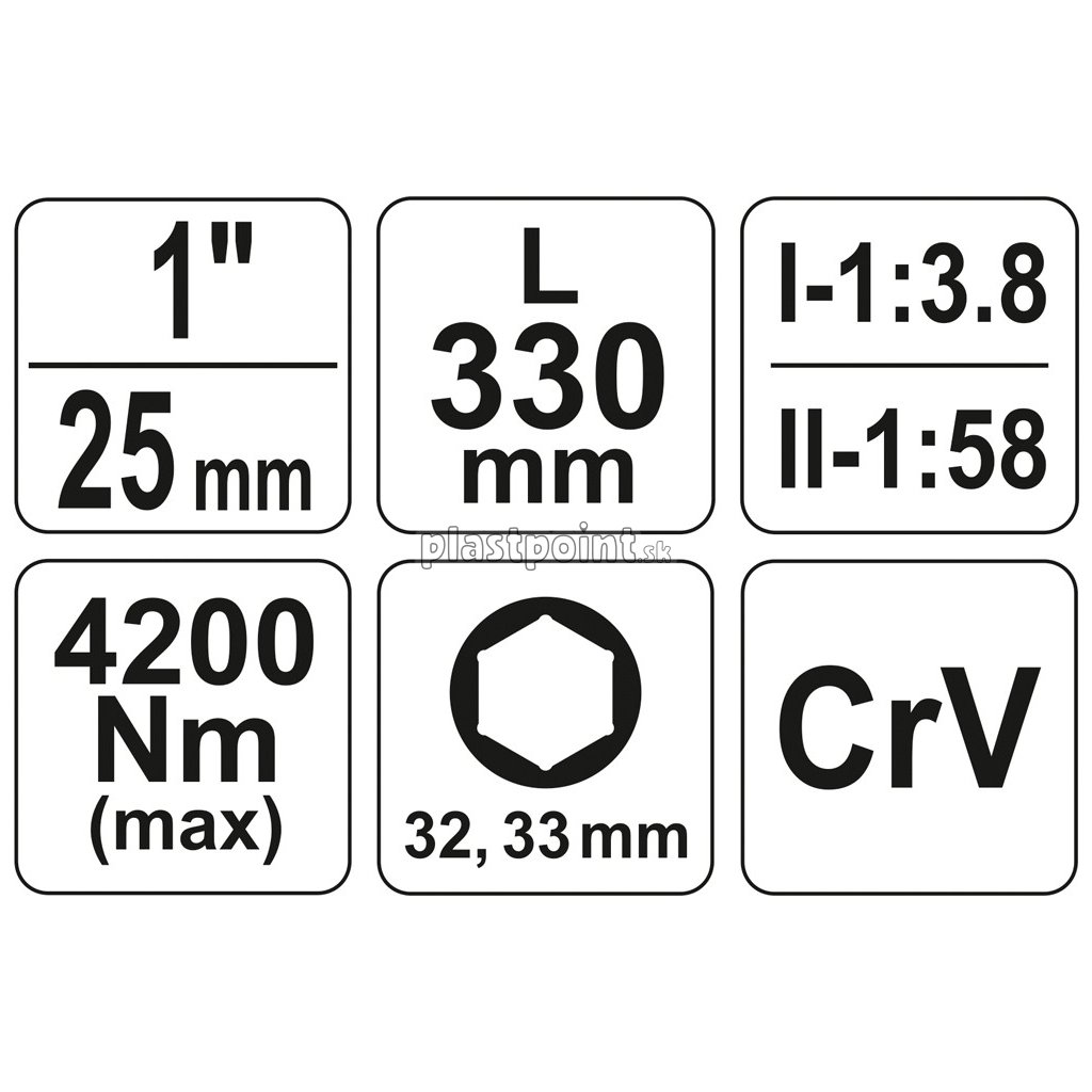 Zosilňovač je vyrobený z kvalitnej CrV ocele dĺžky 330 mm sa zakončí. je uložená v kufri, kde sa nachádza spolu s kovanými nástavcami veľkosti 32 a 33 mm, je teda možné použiť aj na odnímanie kolies nákladných automobilov. 1:58(II)