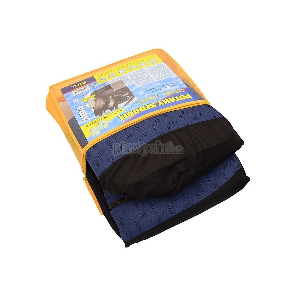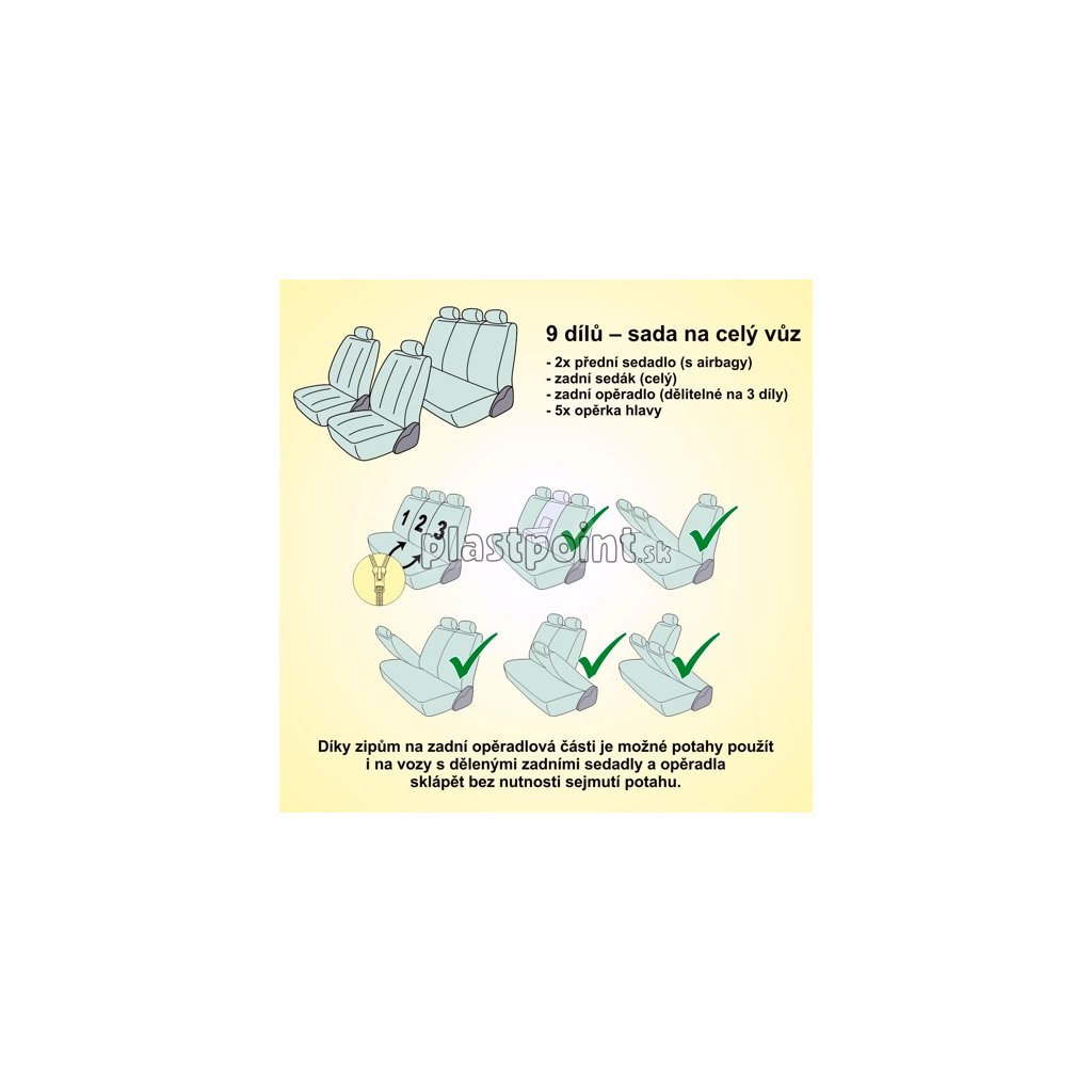 Poťahy sedadiel 'POLY', sada na celé vozidlo. Je možné pripevniť na väčšinu bežne používaných automobilových sedadiel. Poťah je možné použiť na sedadlách, ktoré majú zabudovaný bočný airbag priamo v operadle predných sedadiel. Balenie obsahuje poťah na predné sedadlo (2x), zadné sedák (celý), zadné operadlo (pomocou zipsu deliteľné na 3 diely), opierku hlavy (5x). Vďaka zipsom na zadnej operadlovej časti je možné poťahy použiť aj na vozidlá s delenými zadnými sedadlami a operadlá sklápať bez nutnosti sňatia poťahu.