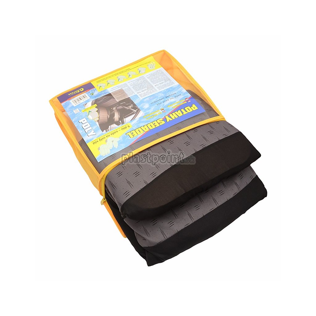 Poťahy sedadiel 'POLY', sada na celé vozidlo. Je možné pripevniť na väčšinu bežne používaných automobilových sedadiel. Poťah je možné použiť na sedadlách, ktoré majú zabudovaný bočný airbag priamo v operadle predných sedadiel. Balenie obsahuje poťah na predné sedadlo (2x), zadné sedák (celý), zadné operadlo (pomocou zipsu deliteľné na 3 diely), opierku hlavy (5x). Vďaka zipsom na zadnej operadlovej časti je možné poťahy použiť aj na vozidlá s delenými zadnými sedadlami a operadlá sklápať bez nutnosti sňatia poťahu.