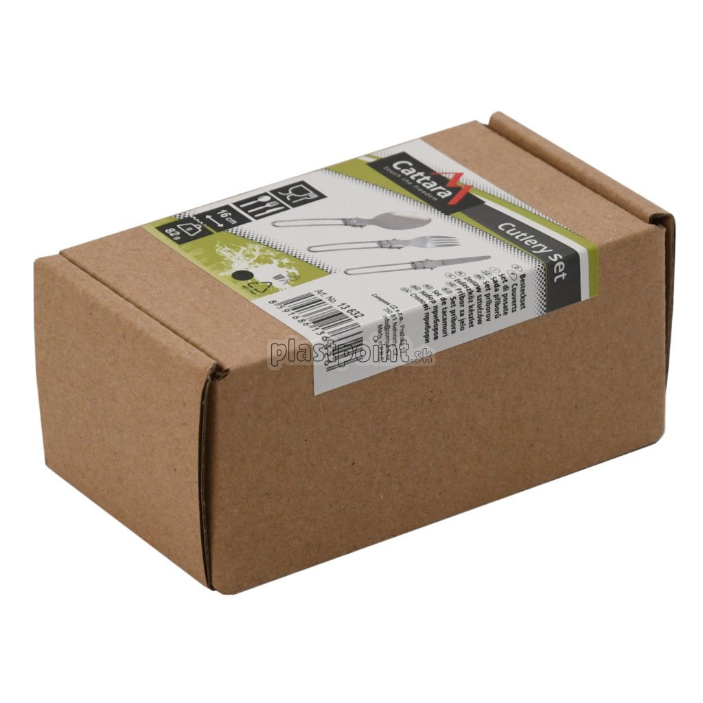 Sada sa skladá z lyžice, noža a vidličky dĺžky 16 cm s celkovou hmotnosťou 80g, uložených v textilnom púzdre s rozmermi 8 x 12 x 3 cm.