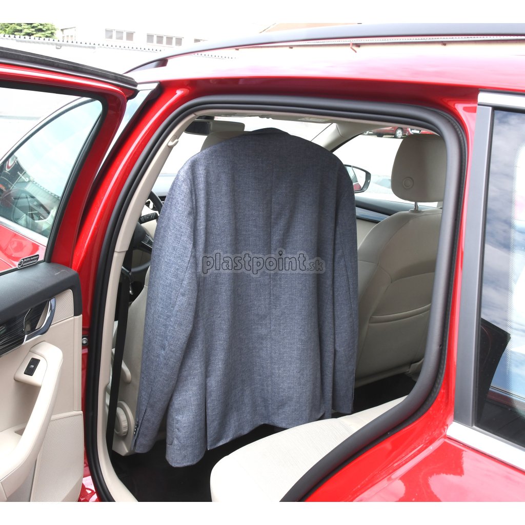Univerzálne ramienko na odevy na pripevnenie na zadnú stranu opierky hlavy predného sedadla automobilu.