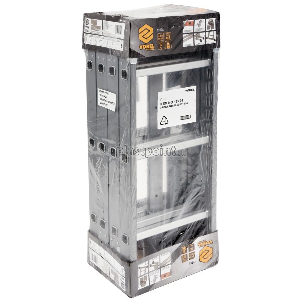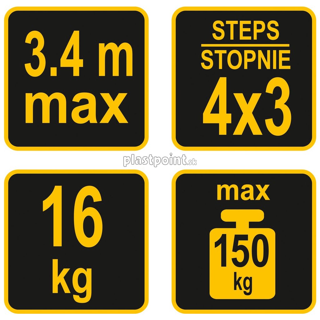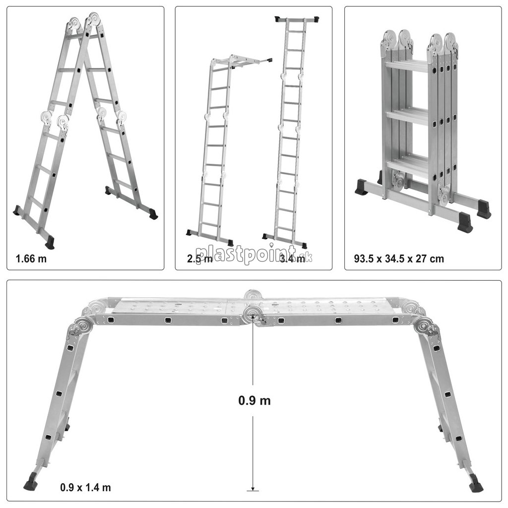 Viacúčelový skladací rebrík, 4x3 priečky, výška až 3,4 metra.
