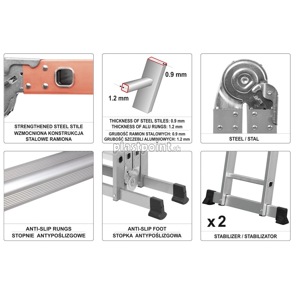 Boky rebríka sú vyrobené z oceľových profilov 0,9 mm, ktoré sú pevnejšie ako hliník rovnakého prevedenia. Priečky sú potom hliníkové s hrúbkou steny 1,2 mm a ich povrchy je protišmykový. Pre vysokú stabilitu je na každej strane rebríka stabilizátor s gumovými nohami. Rebrík je po zložení vysoký necelý 1 meter, ľahko sa tak prepravuje alebo skladuje. Možnosti zloženia rebríka: Rovný rebrík - výška 3,4 metra Lešenie (spolu s podlahami TO-17705) - výška 0,9, šírka 1,4 metra