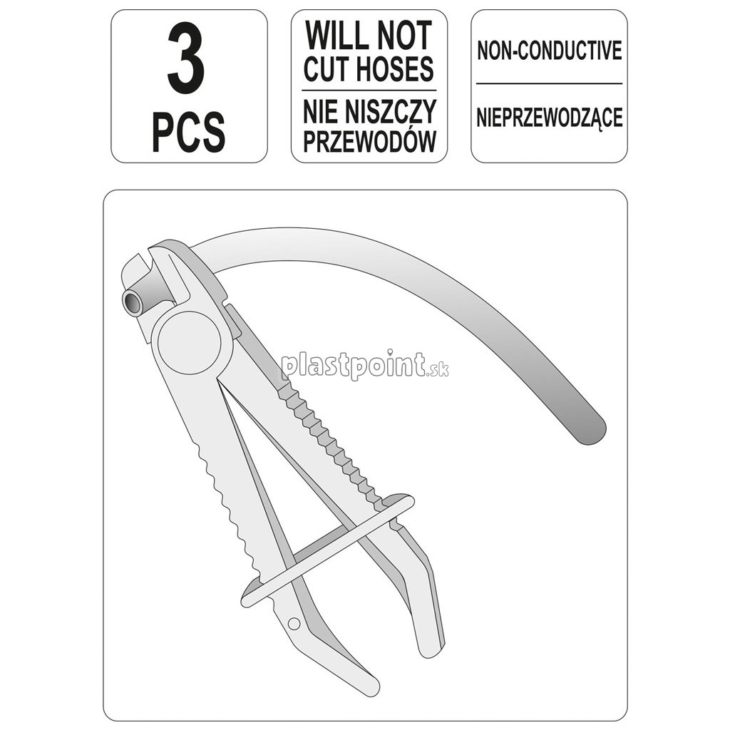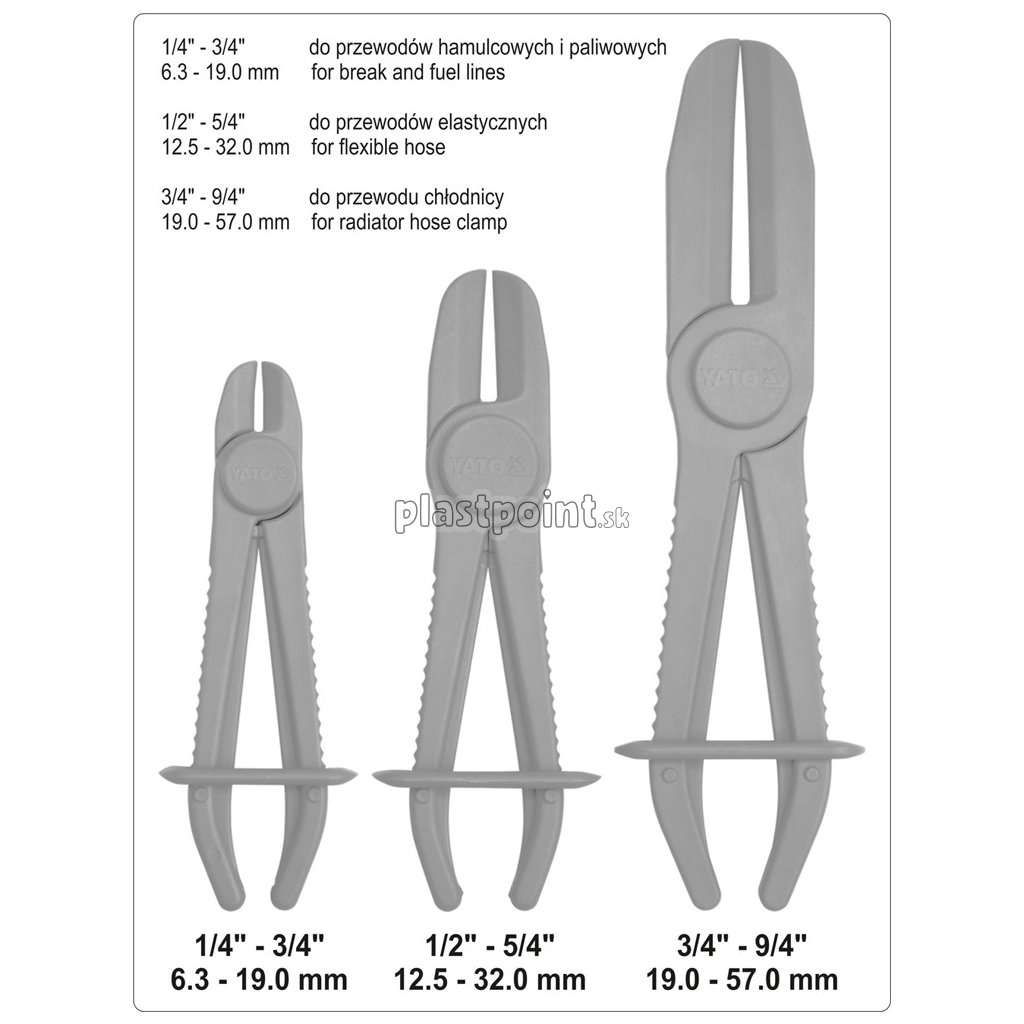 Malá svorka 6,3 - 19 mm pre brzdové a palivové vedenie, stredná svorka 12,5 - 32 mm pre ohybné hadice a veľká svorka 19 - 57 mm pre hadice chladiče.