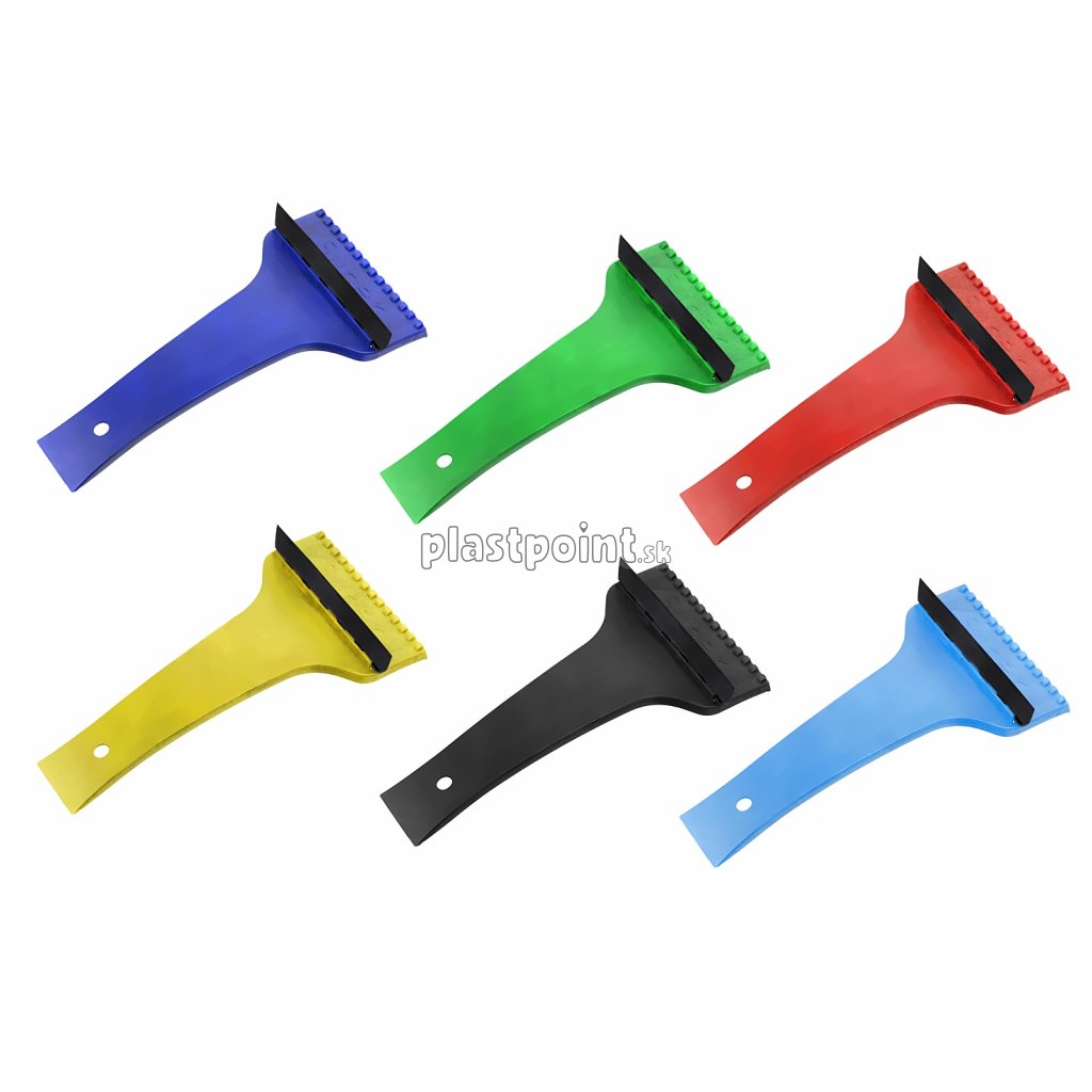 Plastová škrabka na sneh alebo ľad klasickej konštrukcie, vybavená gumovým britom.