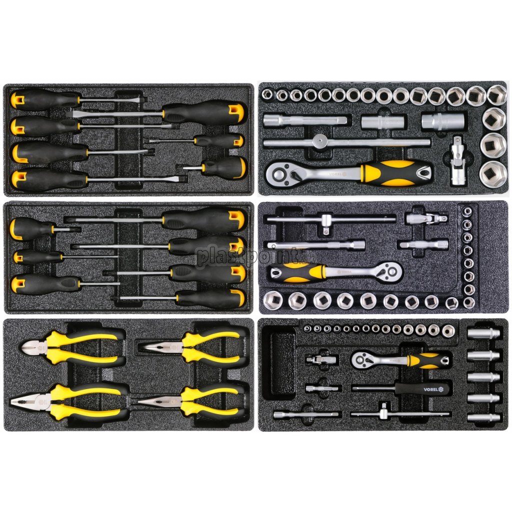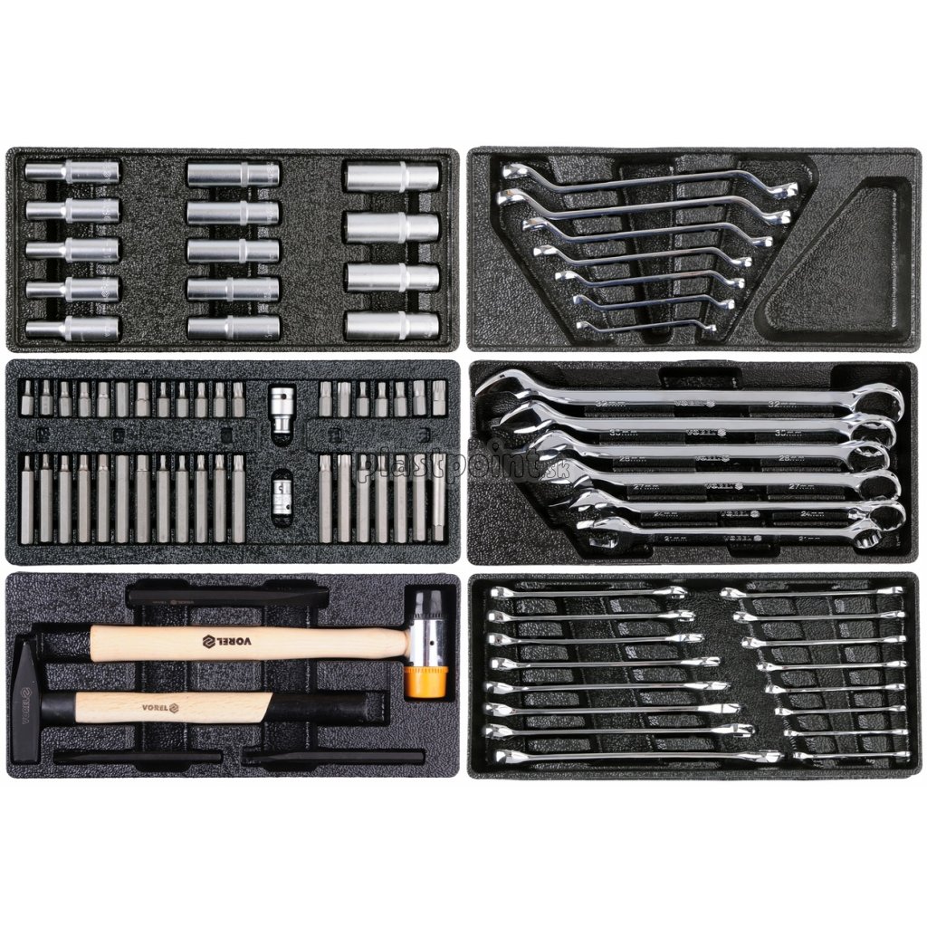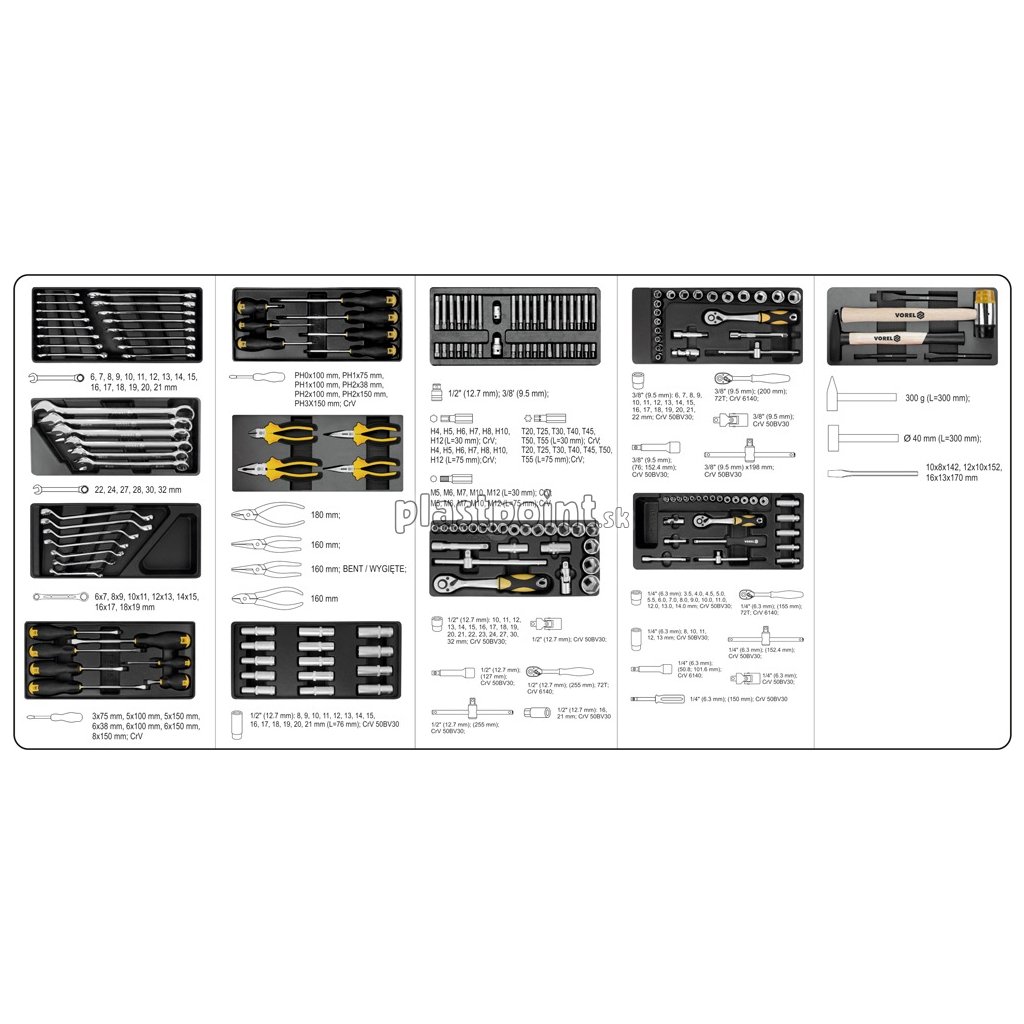 Pojazdná dielenská skrinka vyrobená z kvalitného oceľového plechu, nielen na profesionálne použitie. Prvé 4 šuplíky sú vybavené náradím (celkom 177 ks) v 12-tich plastových vložkách.
