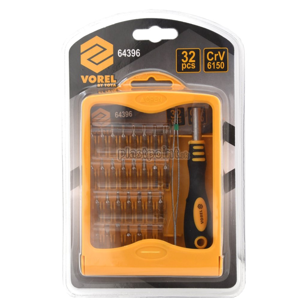 Obsahuje celkom 32ks dielov: najdrobnejšie bity rôznych prevedení z kvalitnej Cr-V ocele, kvalitné, ergonomický skrutkovač a pinzetu.