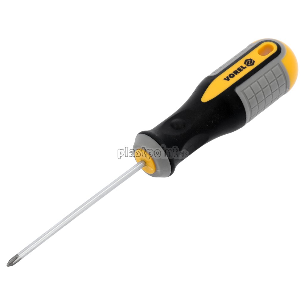 Krížový skrutkovač PH0 x 75 mm. Vyrobené z chróm-vanádiovej CrV ocele. Špička má saténový povrch, dodatočne pieskovaná a magnetizovaná, čo umožňuje pevné uchopenie hlavy skrutky. Rukoväť je vyrobená z dvoch kompozitného plastu. Otvor v rukoväti umožňuje zavesiť skrutkovač.