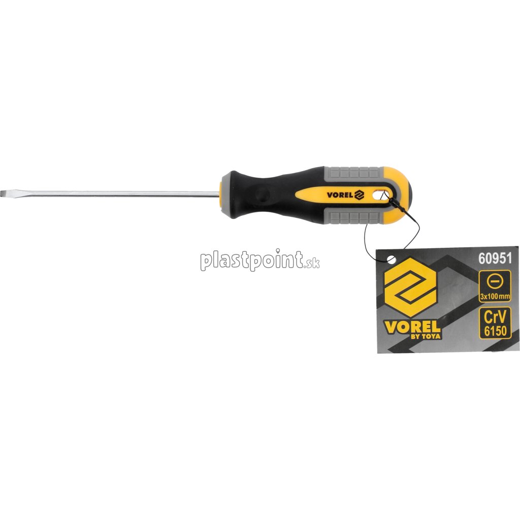Plochý skrutkovač 3x100 mm. Vyrobené z chróm-vanádiovej CrV ocele. Špička má saténový povrch, dodatočne pieskovaná a magnetizovaná, čo umožňuje pevné uchopenie hlavy skrutky. Rukoväť je vyrobená z dvoch kompozitného plastu. Otvor v rukoväti umožňuje zavesiť skrutkovač.