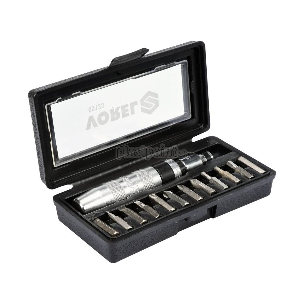 Sada obsahuje rázový skrutkovač s prepínateľným pravým / ľavým chodom. Pri údere kladiva do skrutkovača sa sila prevedie vnútorným mechanizmom na krútiaci moment.