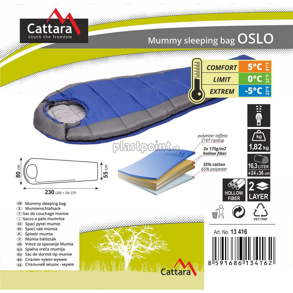 Spací vak múmie Oslo, je spacákom, ktorý dokonale kopíruje telo a má tak najlepšie tepelnoizolačné vlastnosti, ďalej je vybavený zaťažiteľnou kapucňou chrániacou hlavu.