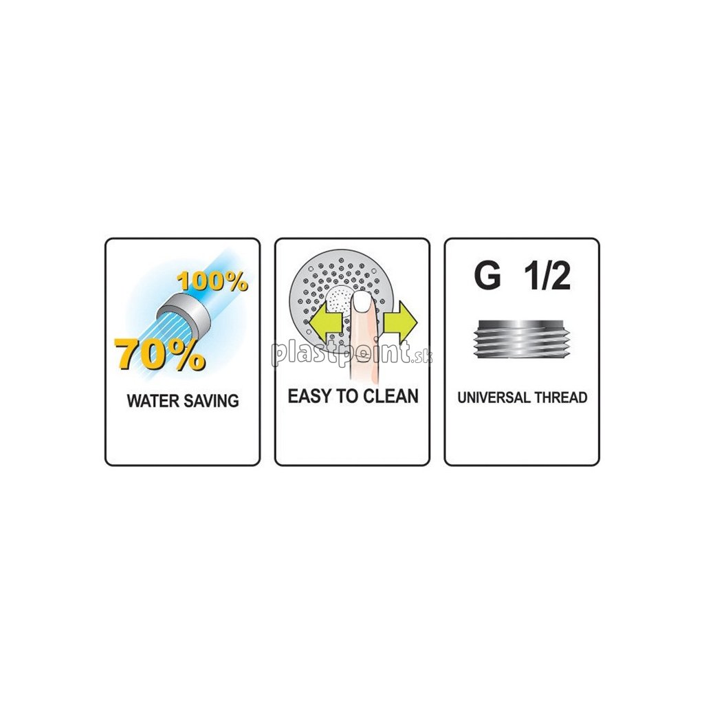 Hlavica je vybavená mechanizmom pre úsporu vody. Proti hromadeniu vodného kameňa slúžia gumové kanáliky.