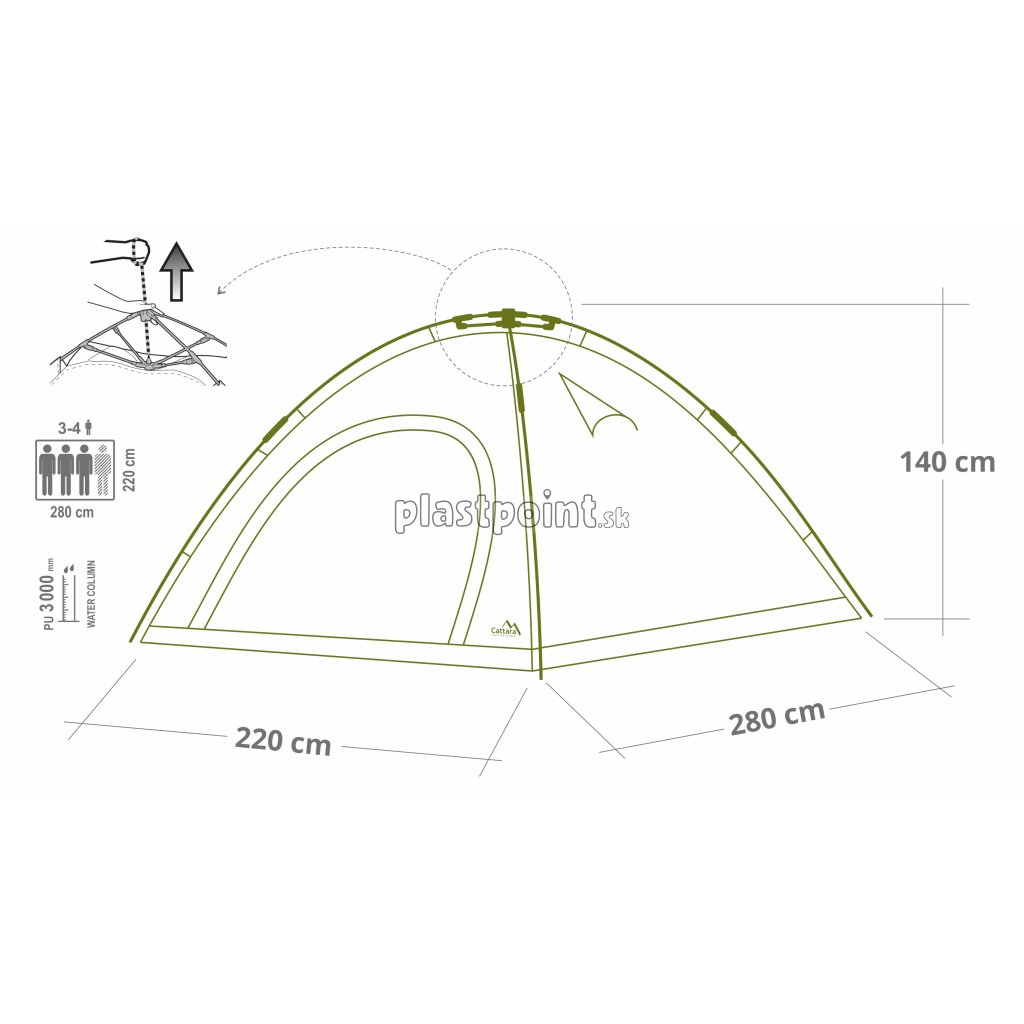 Rýchlo zostaviteľný, vodeodolný stan do akéhokoľvek počasia, s rozmermi 280 x 220 cm a výškou 140 cm, vhodný pre 3-4 osoby.
