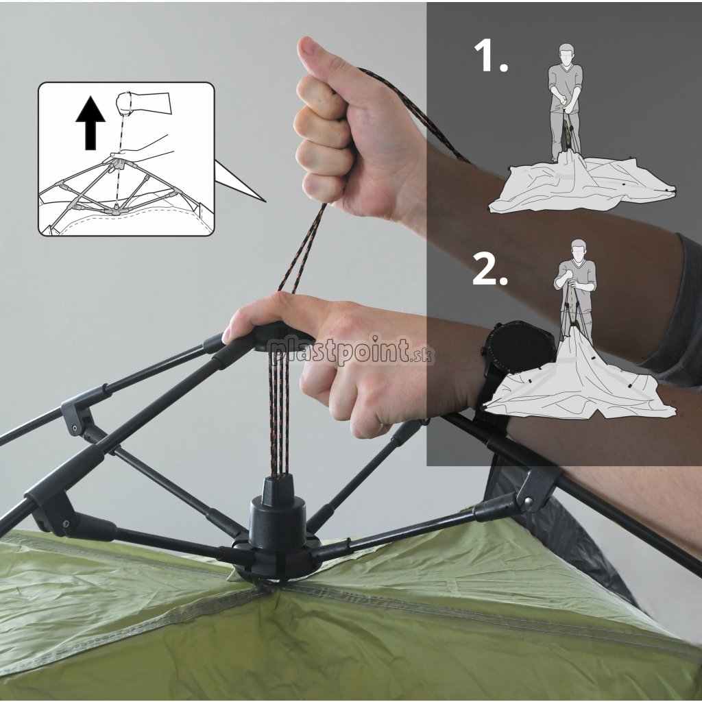 Balenie obsahuje rýchlorozkladací stan, sadu kolíkov (8x), šnúr (4x), obal na jednoduché prenášanie a návod na použitie.