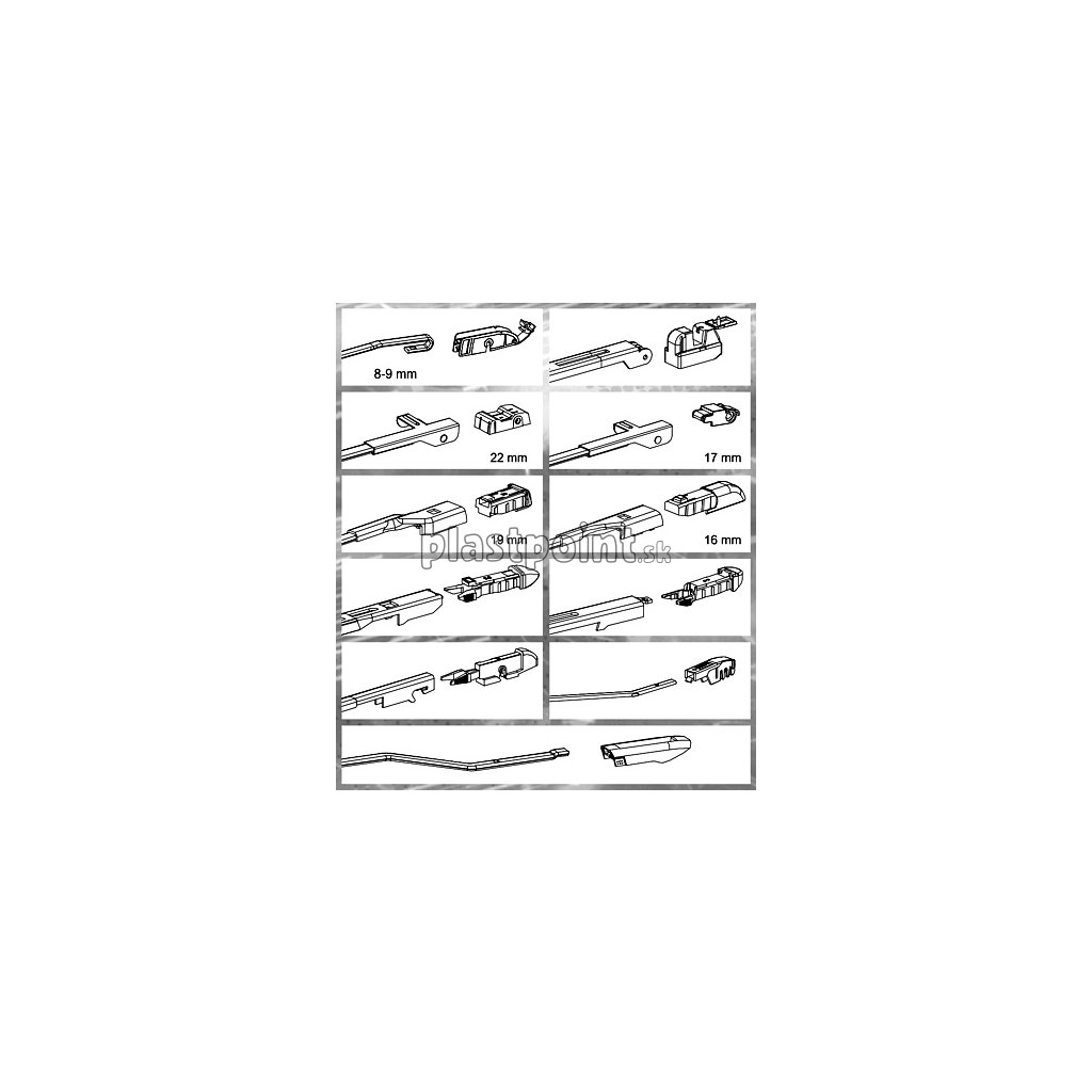 Balenie obsahuje 11 adaptérov, vďaka ktorým je ľahké stierač upevniť na väčšinu bežne používaných zakončení ramienok stieračov, vrátane najnovších vozidiel. Tento typ stierača umožňuje výmenu gumičky (britu).