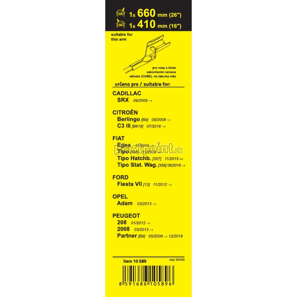Sada dvoch plochých stieračov FLAT (vodič + spolujazdec) so špeciálnym uchytením. Dĺžky stieračov a systém uchytenia na ramienko sú prispôsobené vybraným vozidlám. vozidlá:
