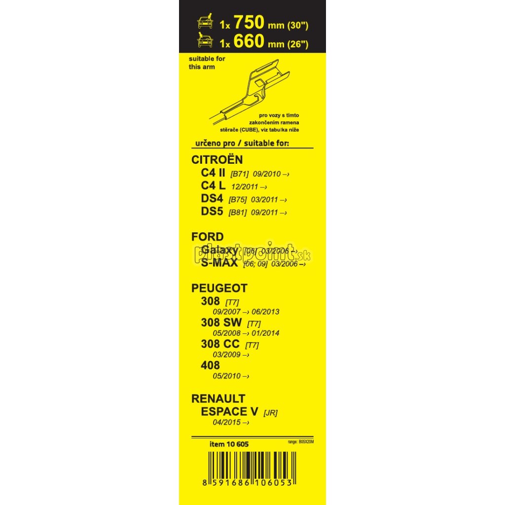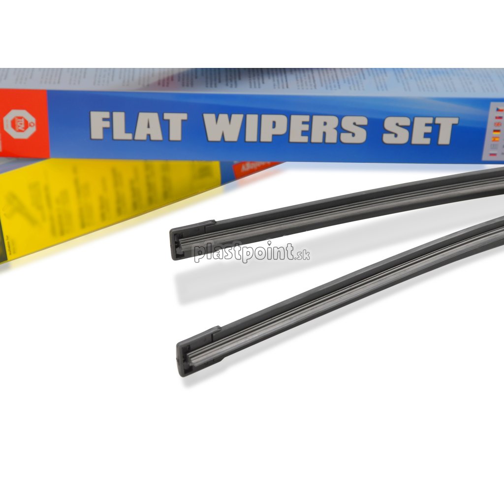 Sada dvoch plochých stieračov FLAT (vodič + spolujazdec) so špeciálnym uchytením. Dĺžky stieračov a systém uchytenia na ramienko sú prispôsobené vybraným vozidlám. vozidlá: