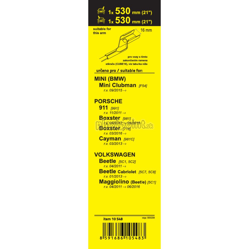Sada dvoch plochých stieračov FLAT (vodič + spolujazdec) so špeciálnym uchytením. Dĺžky stieračov a systém uchytenia na ramienko sú prispôsobené vybraným vozidlám. vozidlá: