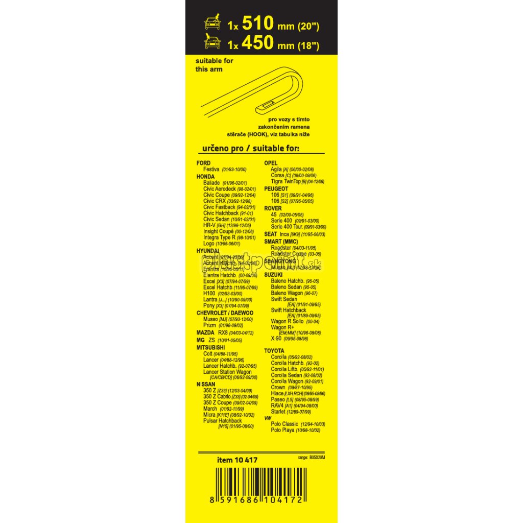 Sada dvoch plochých stieračov FLAT (vodič + spolujazdec) so špeciálnym uchytením. Dĺžky stieračov a systém uchytenia na ramienko sú prispôsobené vybraným vozidlám. vozidlá:
