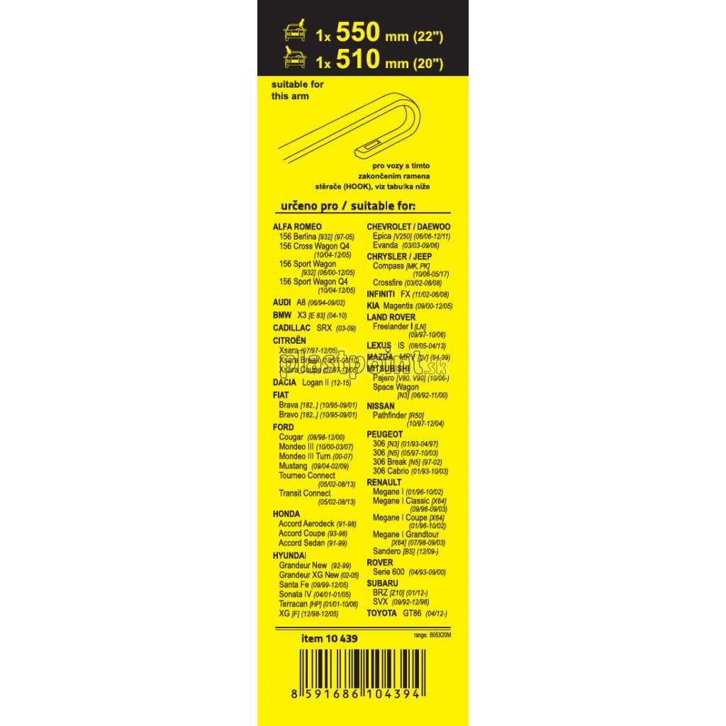 Sada dvoch plochých stieračov FLAT (vodič + spolujazdec) so špeciálnym uchytením. Dĺžky stieračov a systém uchytenia na ramienko sú prispôsobené vybraným vozidlám. vozidlá: