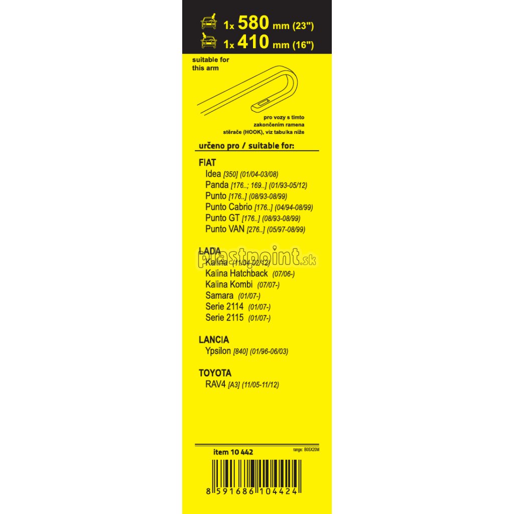 Sada dvoch plochých stieračov FLAT (vodič + spolujazdec) so špeciálnym uchytením. Dĺžky stieračov a systém uchytenia na ramienko sú prispôsobené vybraným vozidlám. vozidlá: