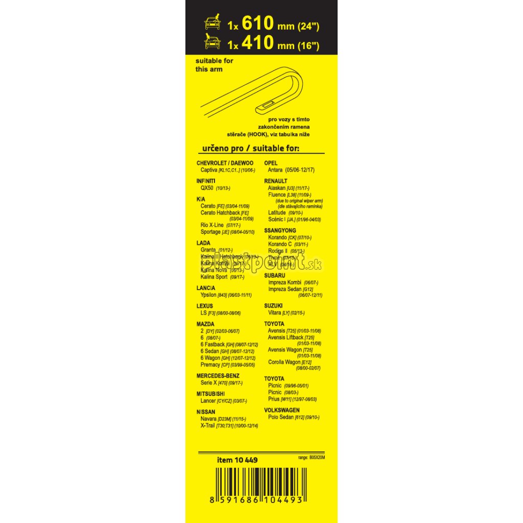 Sada dvoch plochých stieračov FLAT (vodič + spolujazdec) so špeciálnym uchytením. Dĺžky stieračov a systém uchytenia na ramienko sú prispôsobené vybraným vozidlám. vozidlá: