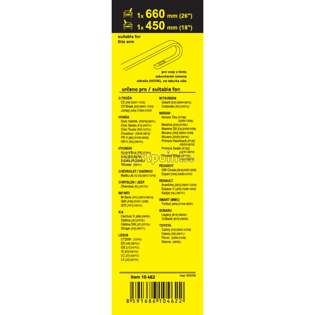 Sada dvoch plochých stieračov FLAT (vodič + spolujazdec) so špeciálnym uchytením. Dĺžky stieračov a systém uchytenia na ramienko sú prispôsobené vybraným vozidlám. vozidlá: