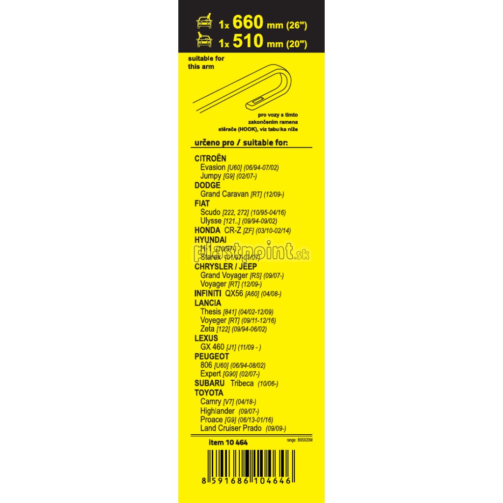 Sada dvoch plochých stieračov FLAT (vodič + spolujazdec) so špeciálnym uchytením. Dĺžky stieračov a systém uchytenia na ramienko sú prispôsobené vybraným vozidlám. vozidlá: