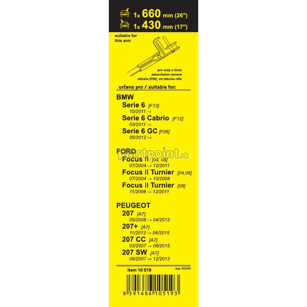 Sada dvoch plochých stieračov FLAT (vodič + spolujazdec) so špeciálnym uchytením. Dĺžky stieračov a systém uchytenia na ramienko sú prispôsobené vybraným vozidlám. vozidlá: