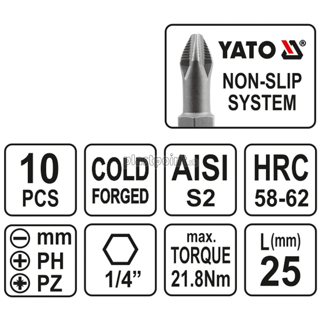 Kvalitné bity Yato so systémom Non-Slip, kedy je hrot bitu vybavený rebrovaním zabraňujúcim skĺznutiu skrutky a zvyšujúcim prenos krútiaceho momentu.