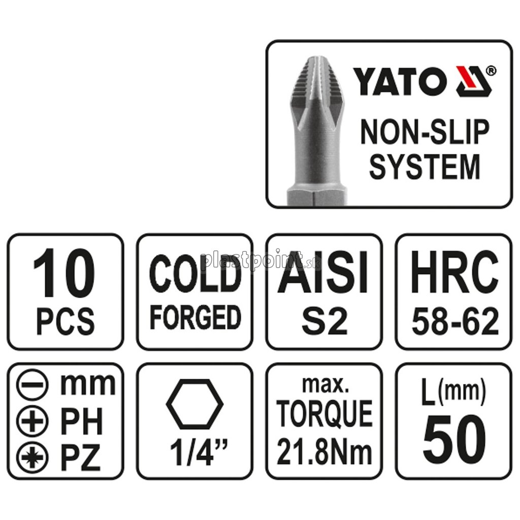 Kvalitné bity Yato so systémom Non-Slip, kedy je hrot bitu vybavený rebrovaním zabraňujúcim skĺznutiu skrutky a zvyšujúcim prenos krútiaceho momentu.